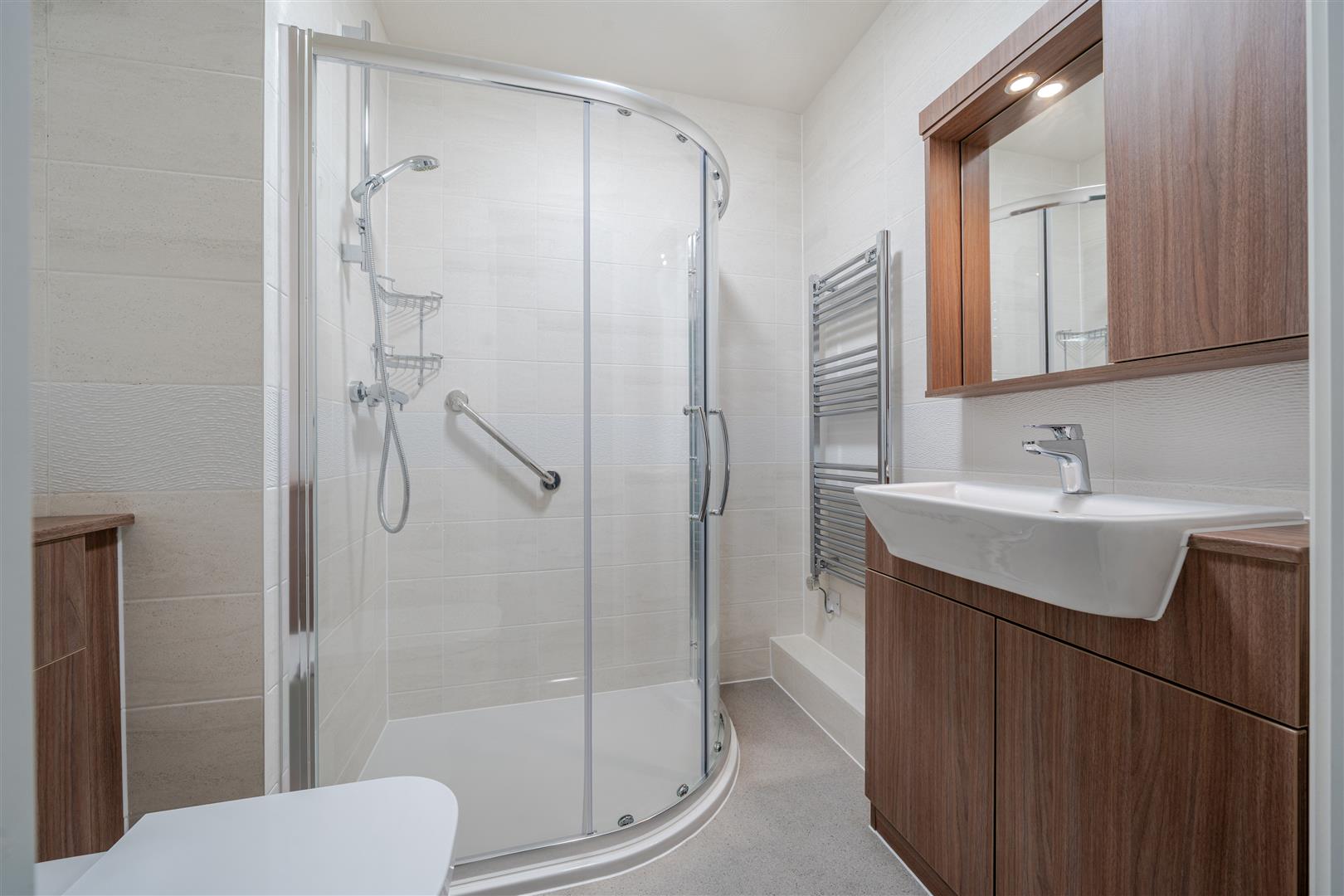 The Shower Room offers a curved shower with handrail, a WC, wash hand basin with vanity unit beneath and a heated towel rail.