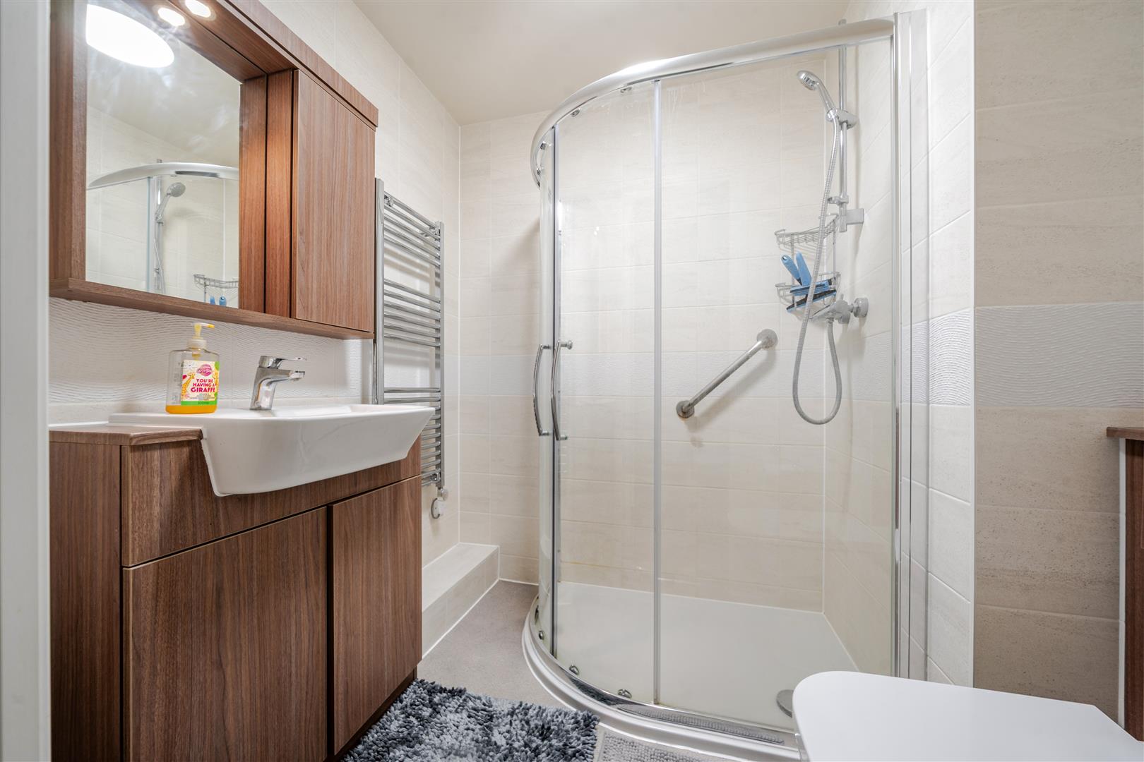The Shower Room offers a curved shower with handrail, a WC and wash hand basin with vanity unit beneath and a heated towel rail.