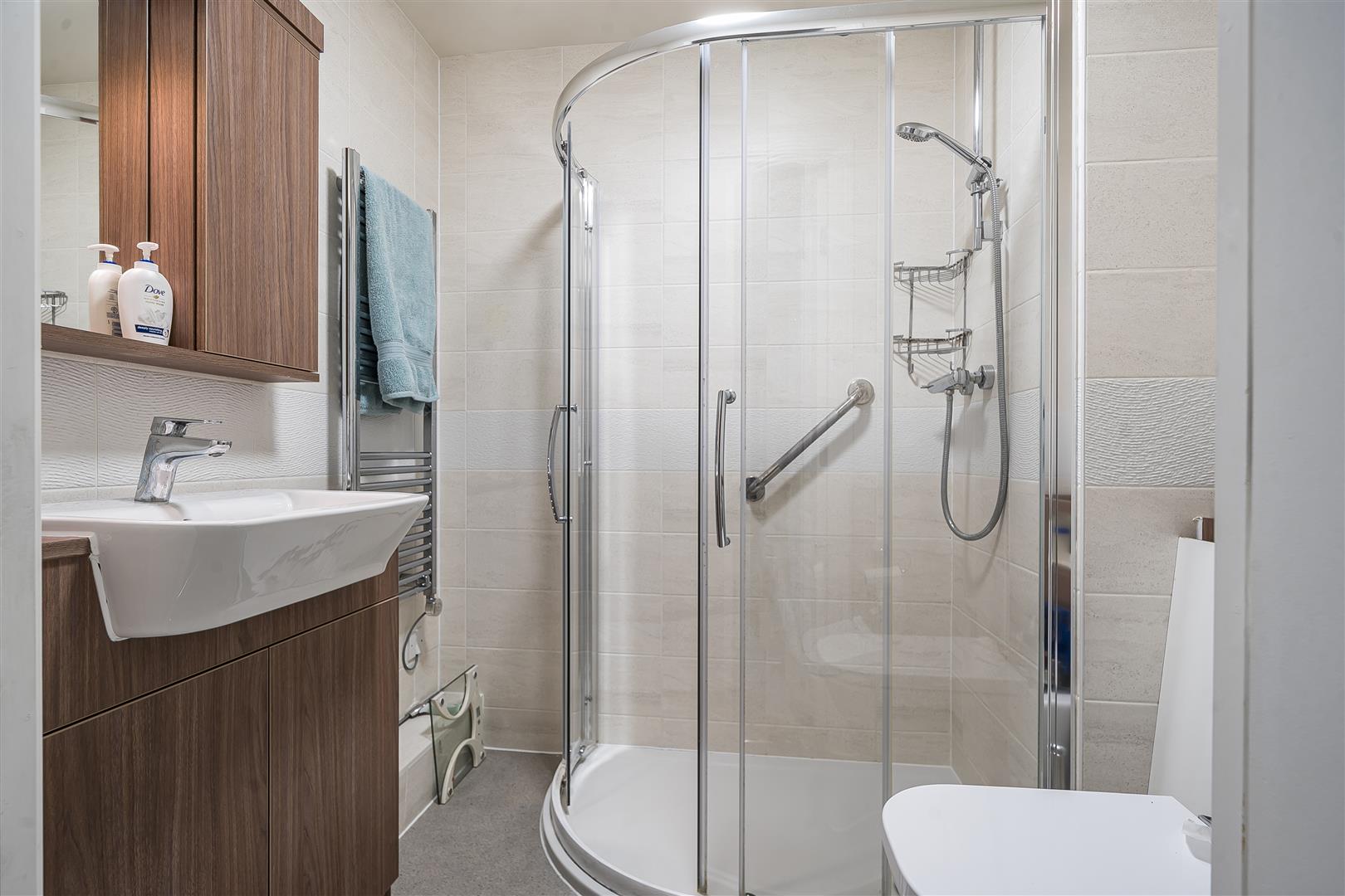 The Shower Room offers a curved shower with handrail, a heated towel rail, WC and wash basin with vanity unit beneath.