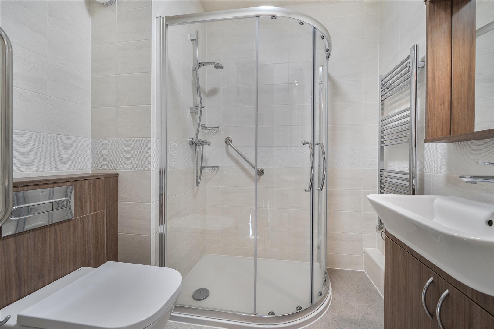 The Shower Room offers a curved shower with handrail, a WC and wash basin with vanity unit beneath and a heated towel rail.
