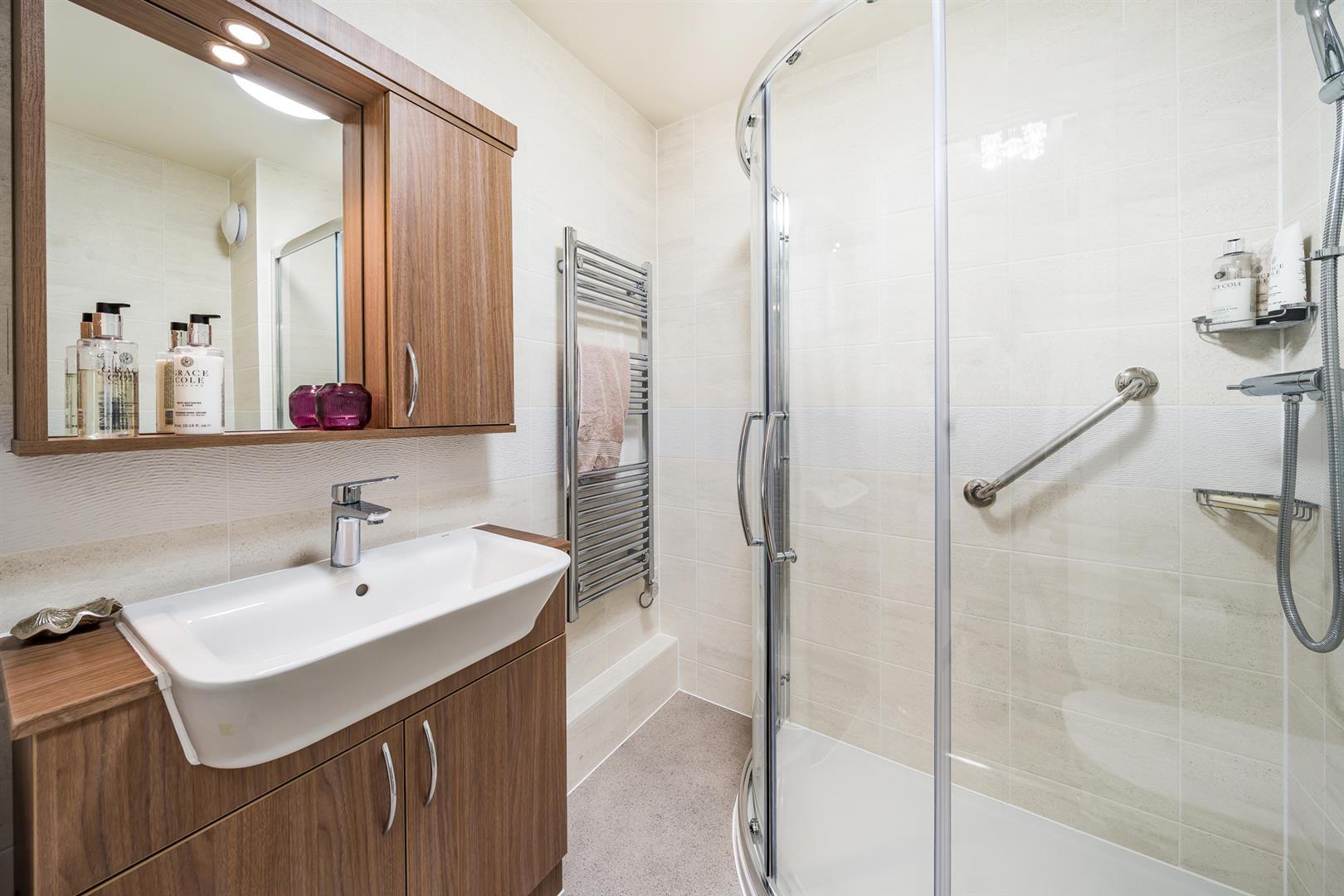 The Shower Room offers a curved shower cubicle with handrail, heated towel rail, WC and wash basin with vanity unit beneath.