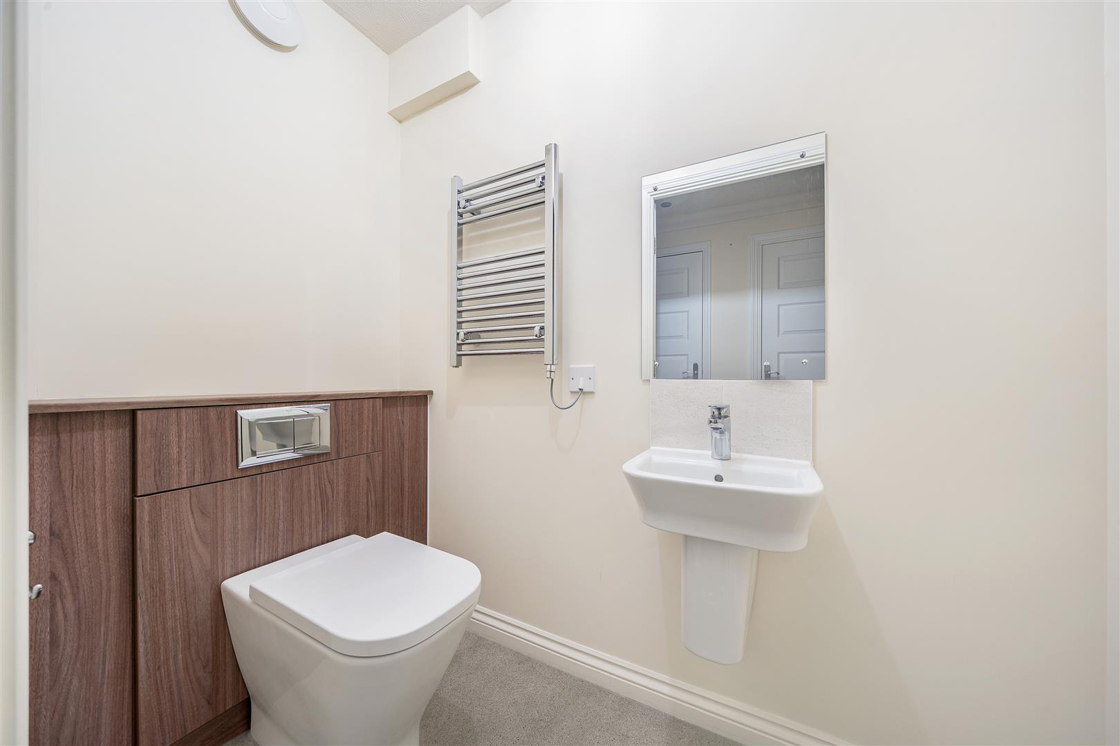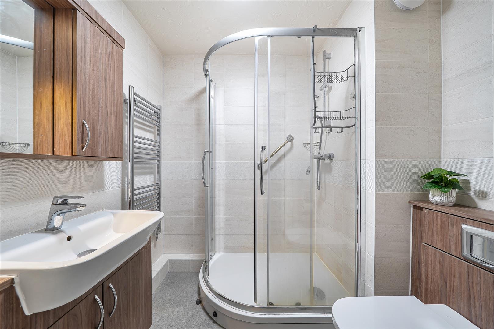 The Shower Room offers a curved shower with handrail, heated towel rail, a WC and wash hand basin with vanity unit beneath.