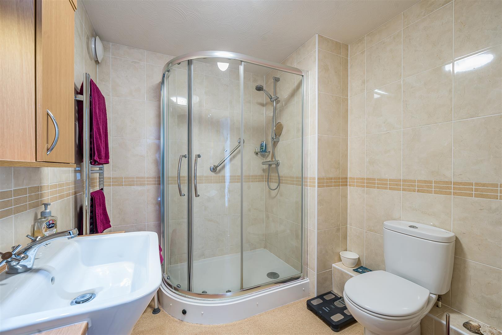 The Shower Room offers a curved shower with handrail, a WC, wash hand basin with vanity unit beneath and a heated towel rail.