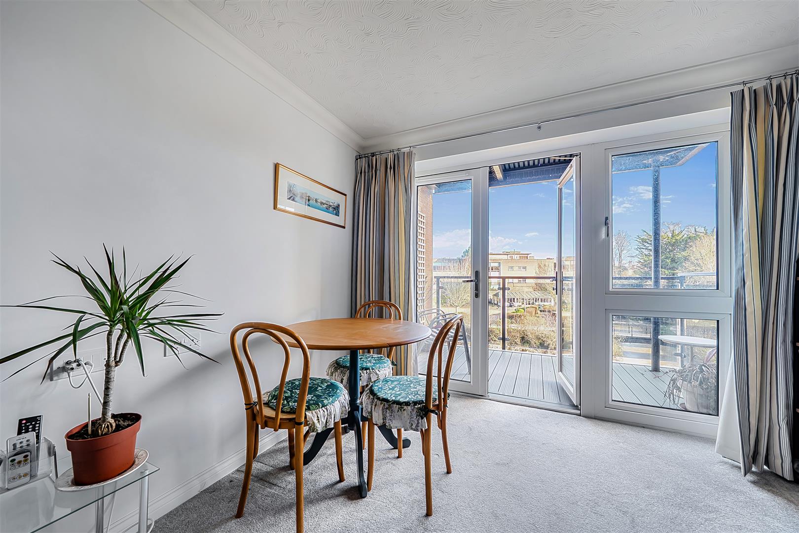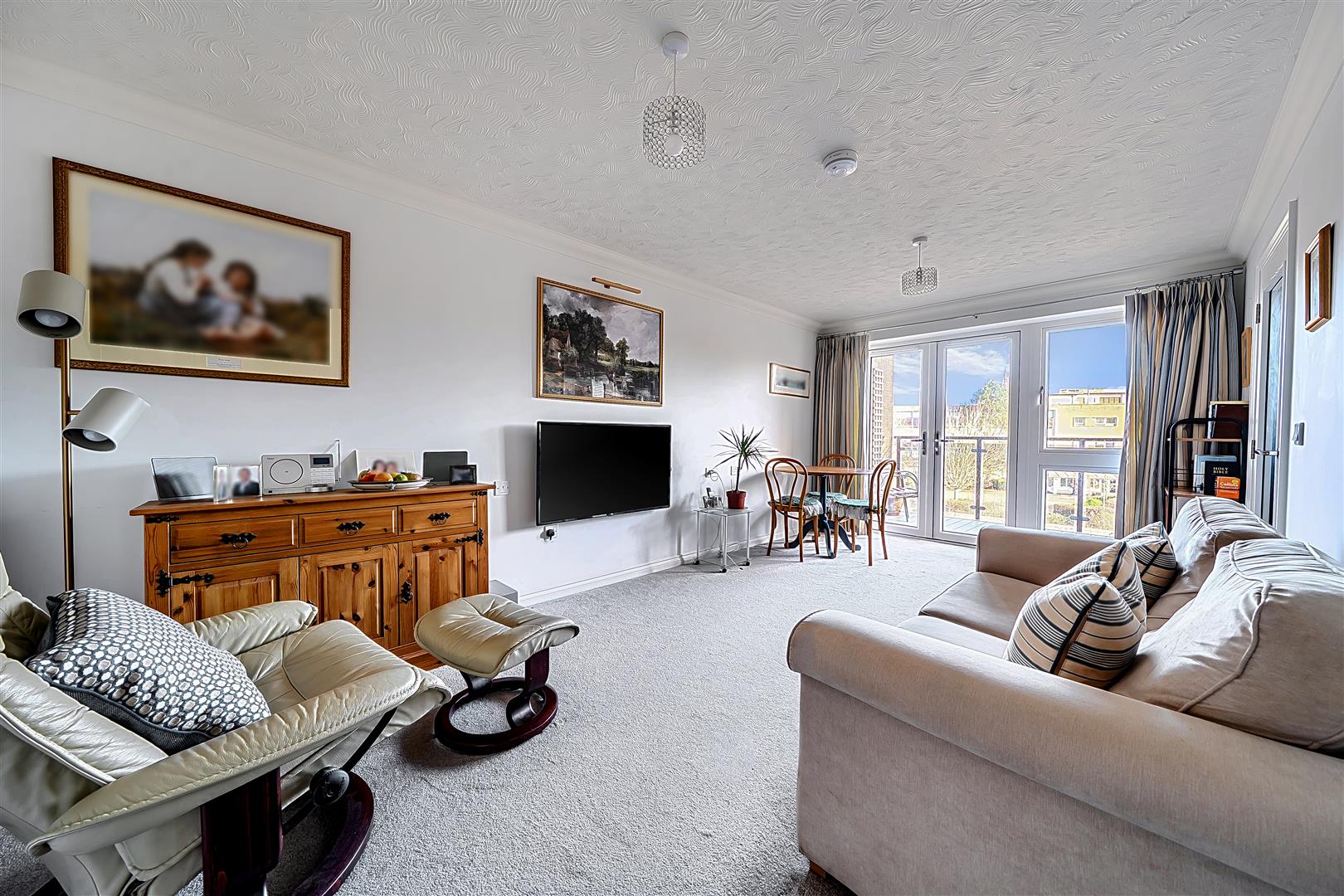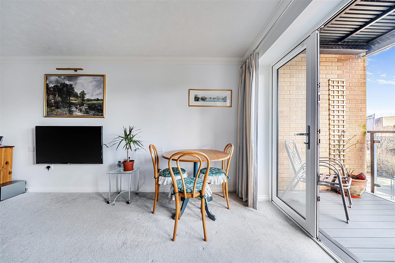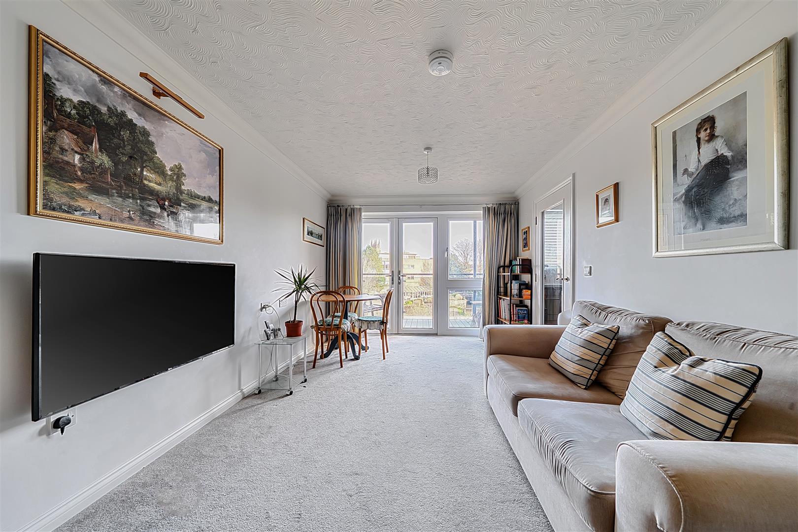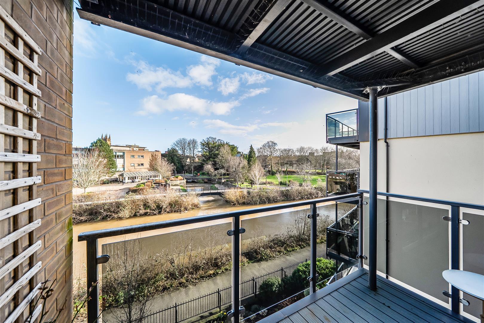The living room offers ample space for living and dining room furniture. A French door opens to the owners private balcony boasting views of the River Tone, Goodland Gardens and Castle Green.