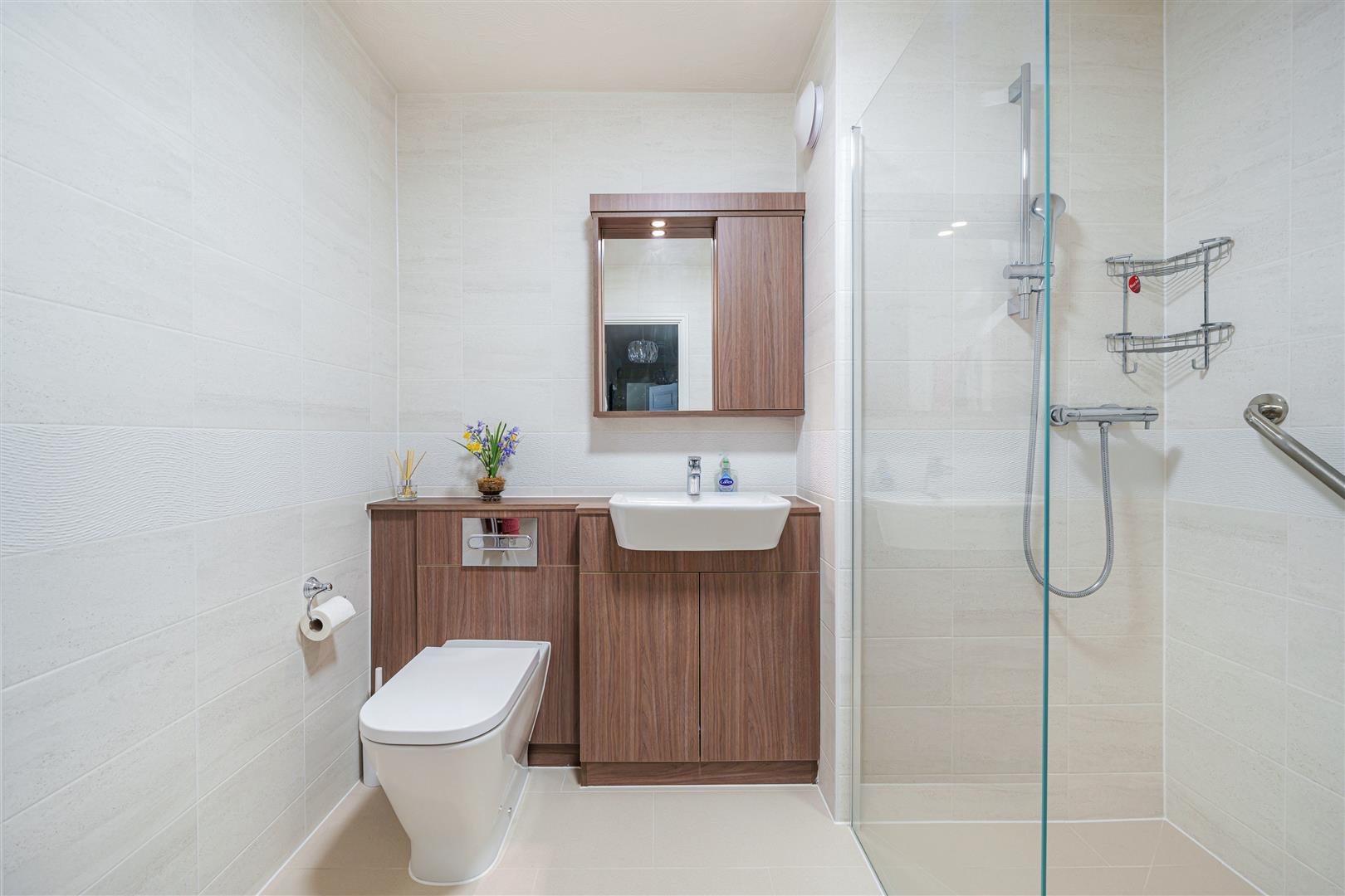 The Shower Room offers a large shower cubicle with handrail, heated towel rail, a WC and wash hand basin with vanity unit beneath.