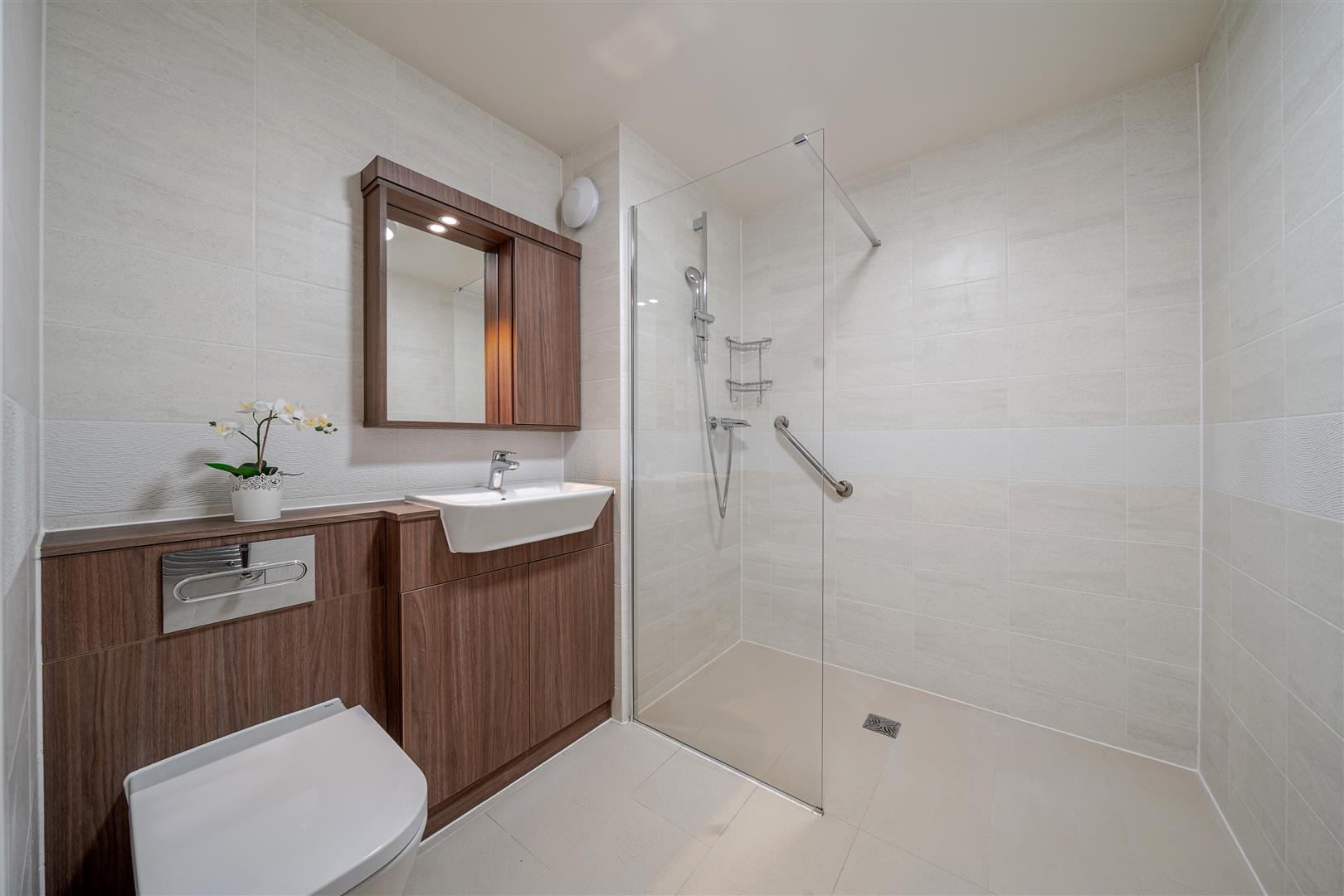 The shower room offers a large walk in shower with handrail, a WC, wash hand basin with vanity unit beneath and a heated towel rail.