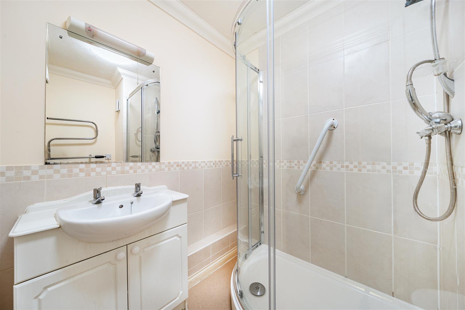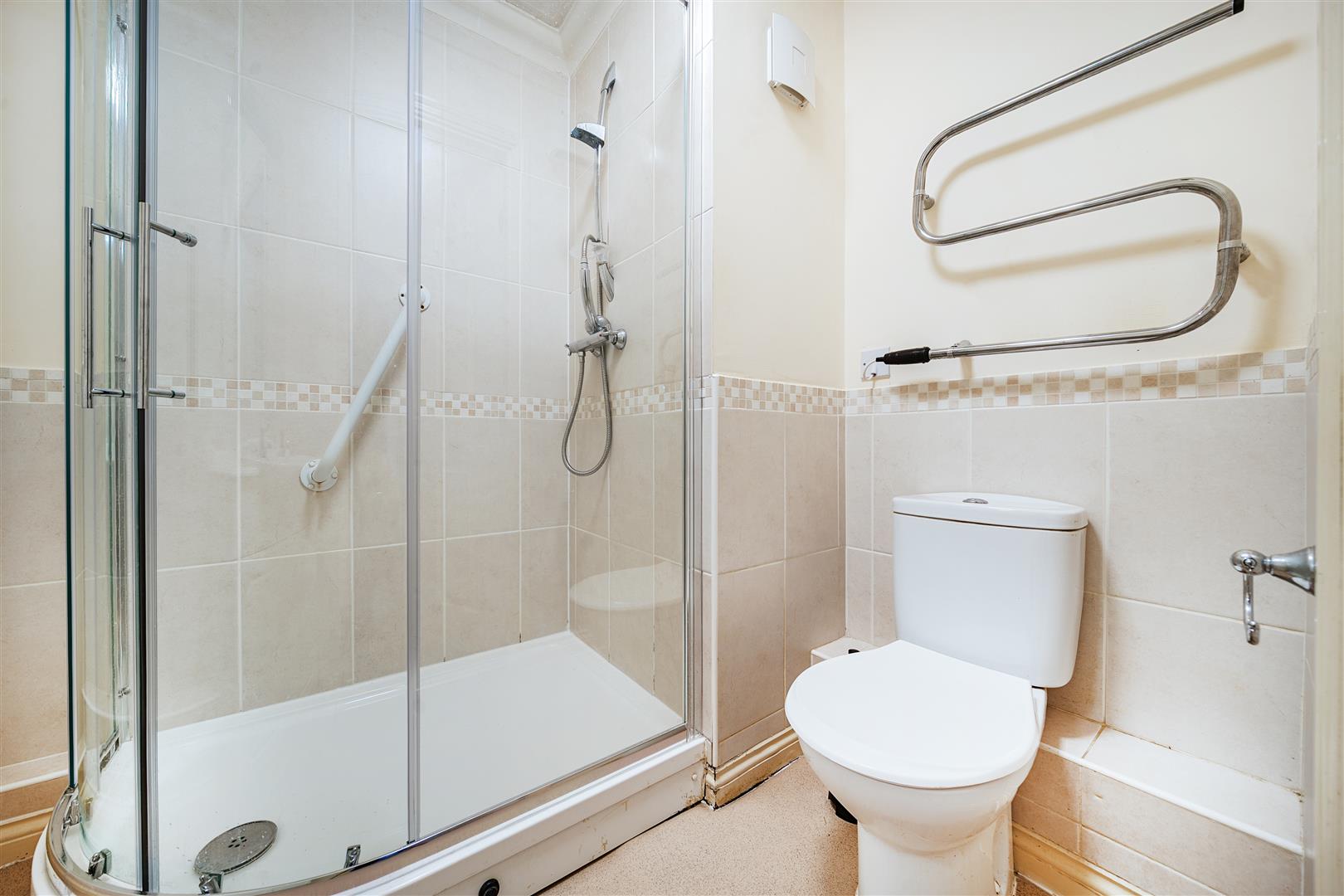 The Shower Room offers a curved shower cubicle with handrail, heated towel rail, a WC and wash basin with vanity unit beneath.