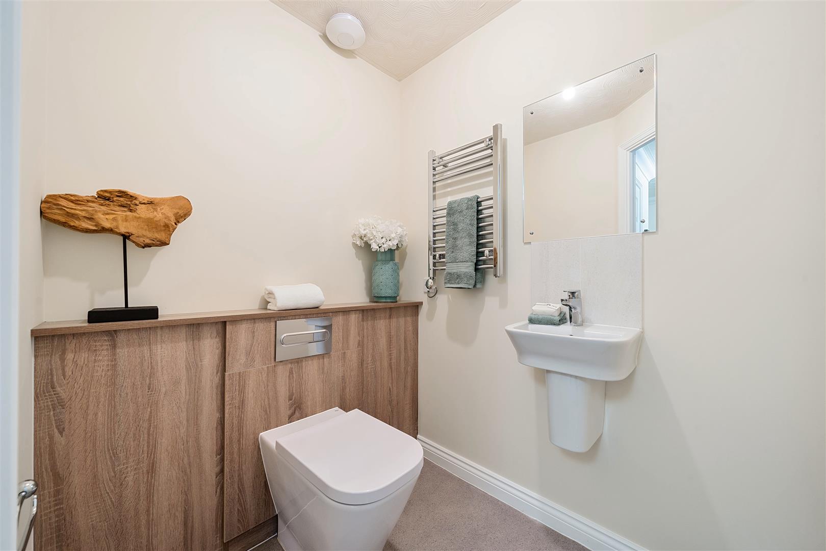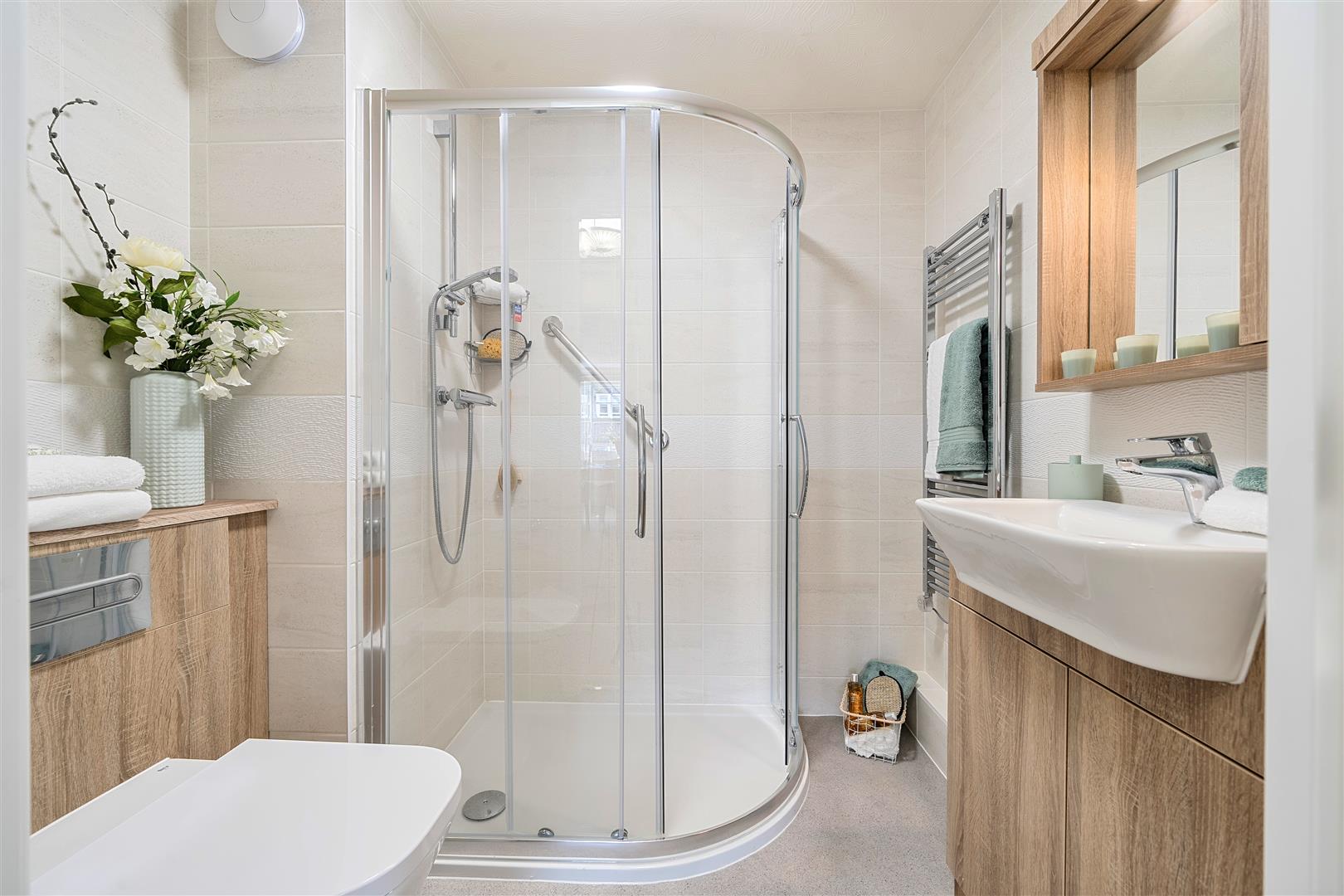 The shower room offers a good size shower cubicle with handrail, a WC and wash basin with vanity unit underneath. A separate WC with wash basin and heated towel rail is accessed via the hallway.