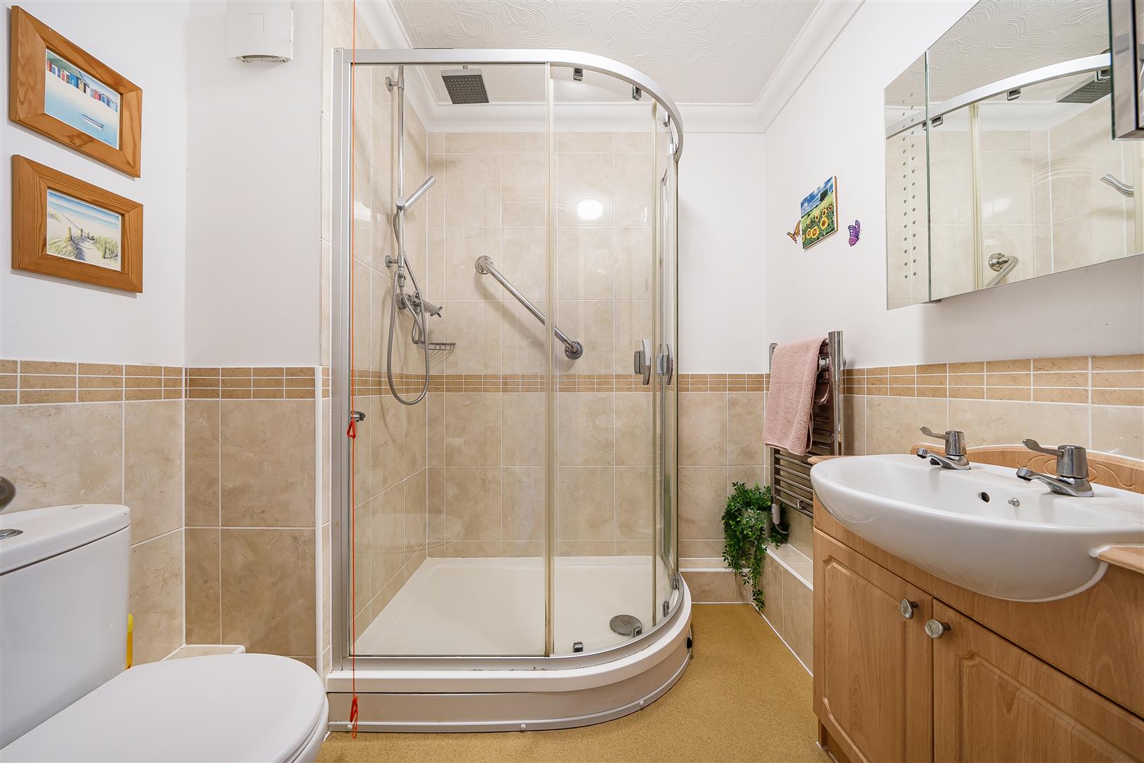 The shower room offers a curved shower with handrail, a WC and wash hand basin with vanity unit beneath and a heated towel rail.