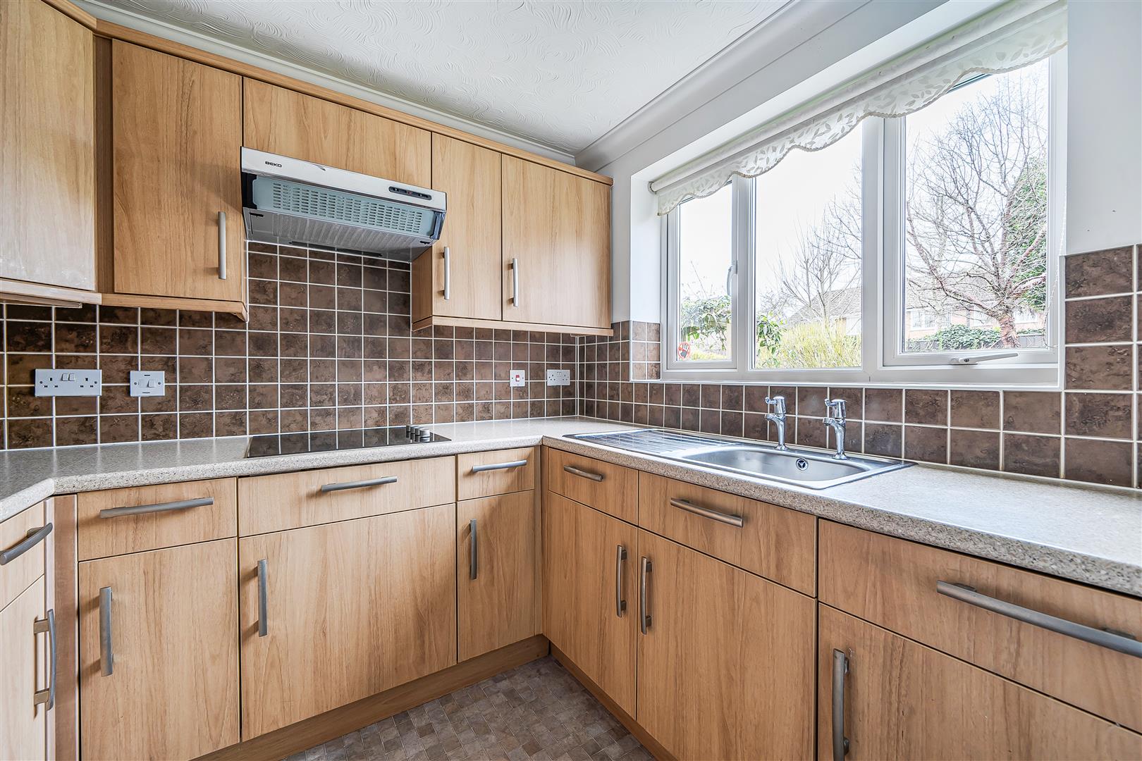 The kitchen is accessed via the living room and offers a range of eye and base level units with working surfaces over and tiled splashbacks. There is a built in waist height oven, 4 ring electric hob with extractor hood over, a fridge and a freezer. A window allows for light and ventilation.