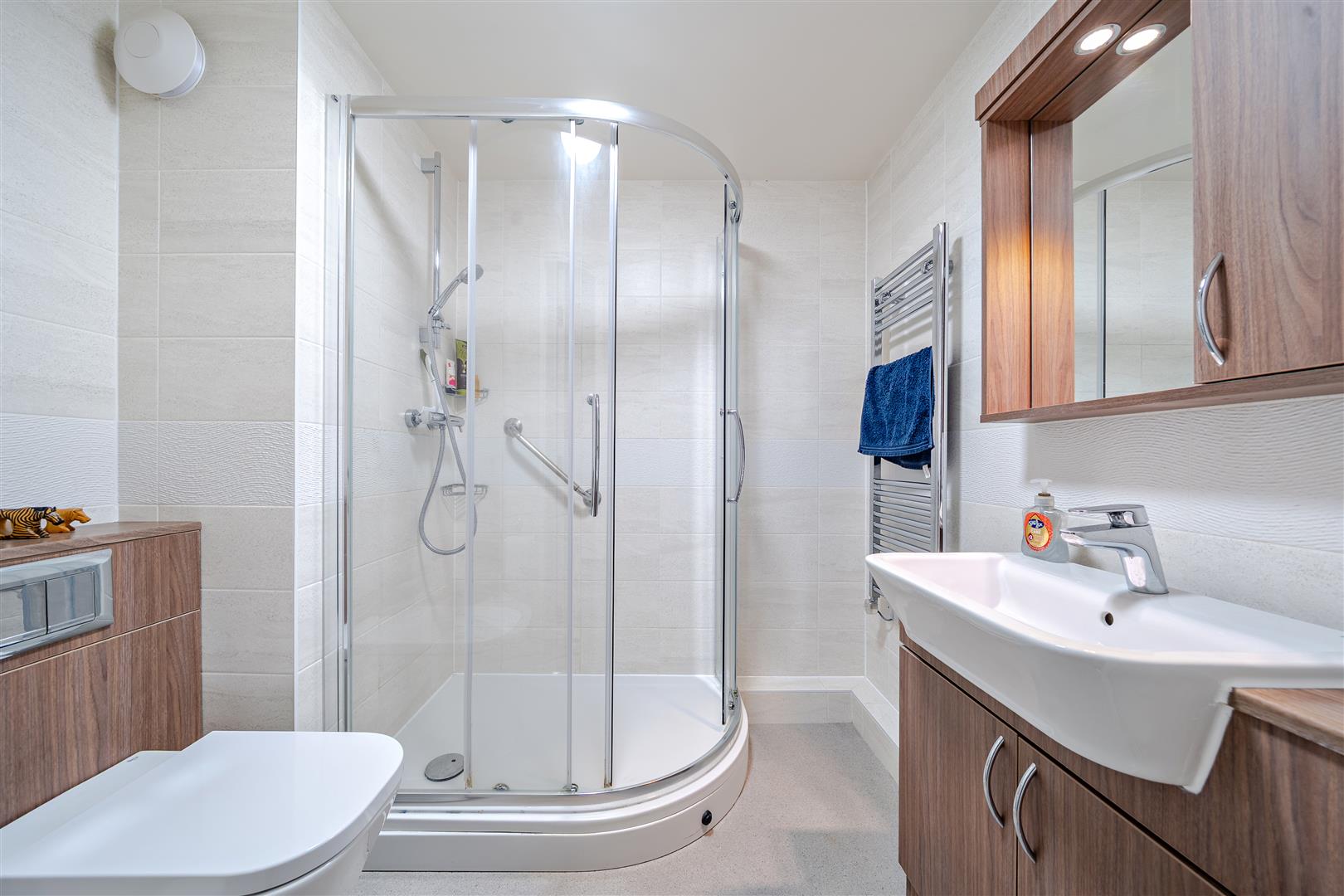 The Shower Room offers a curved shower with handrail, a WC, wash hand basin with vanity unit beneath and a heated towel rail.
