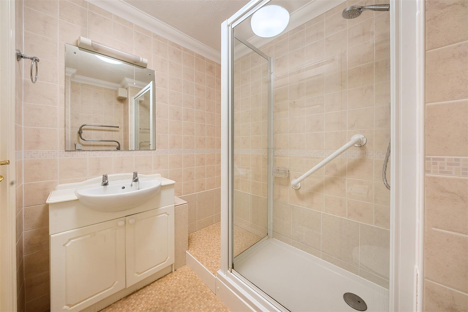 The Shower Room offers a large shower with handrail, a WC, wash hand basin with vanity unit beneath and a heated towel rail.