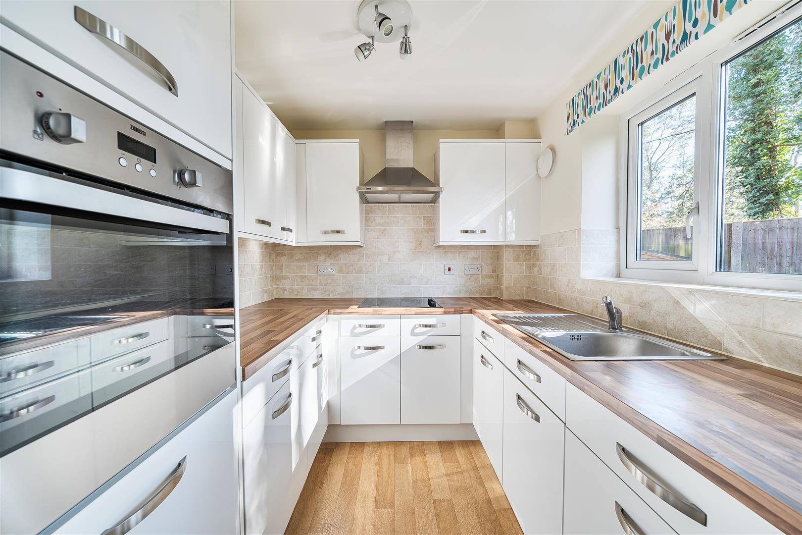The kitchen offers a range of modern eye and base level units with working surfaces over and tiled splashbacks. There is a built in waist height oven, 4 ring electric hob, fridge and freezer. Windows provide light and ventilation.