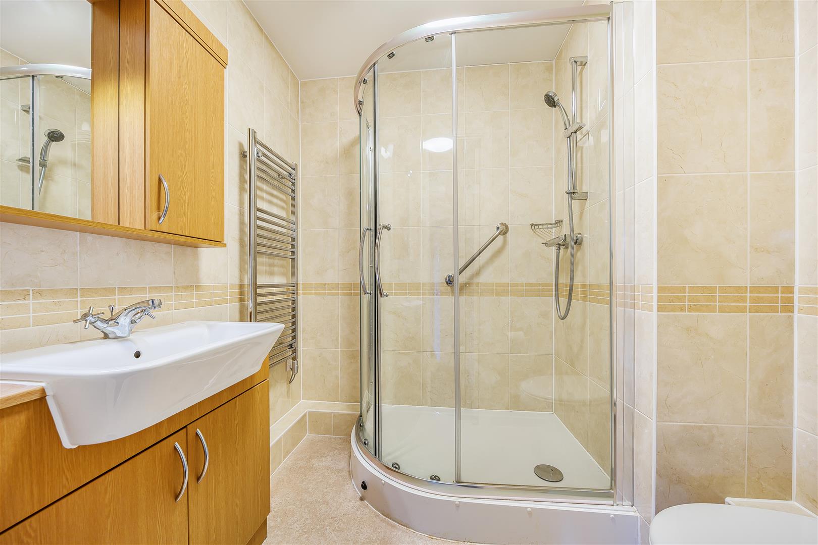 The shower room offers a curved shower with handrail, a WC, wash hand basin with vanity unit beneath and a heated towel rail.
