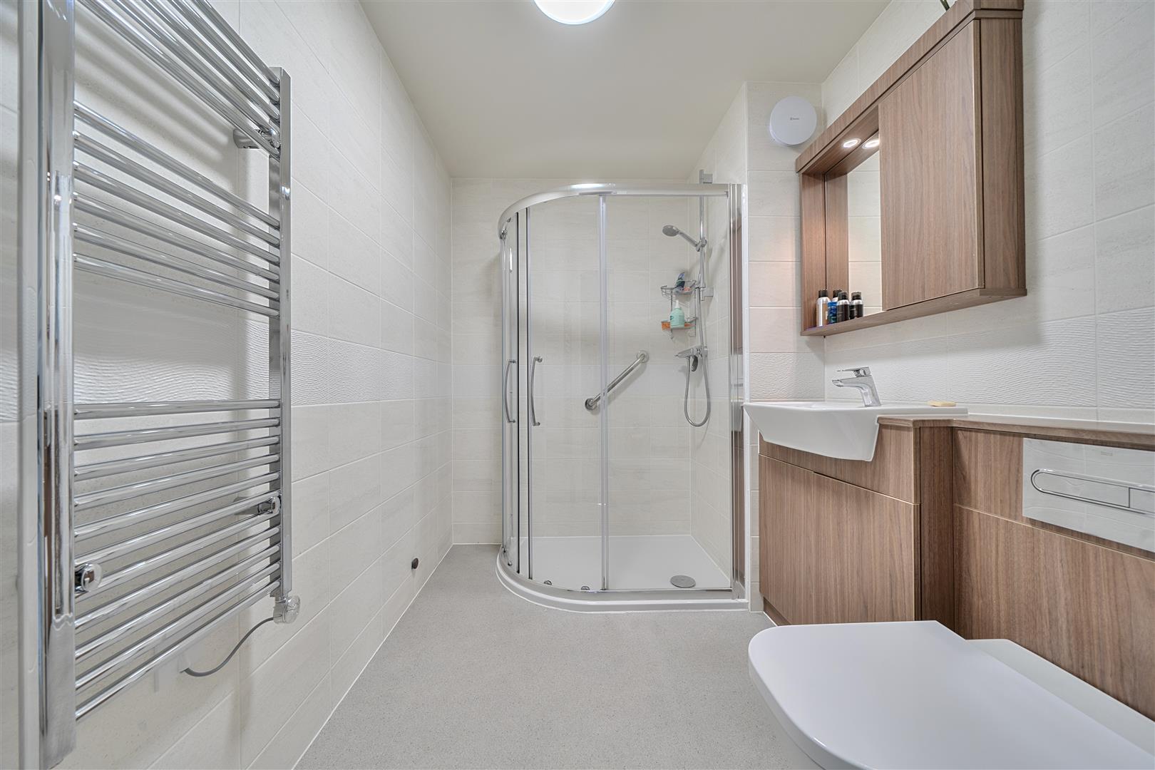 The Shower room offers a large curved shower with handrail, a WC and wash hand basin with vanity unit beneath and a heated towel rail.