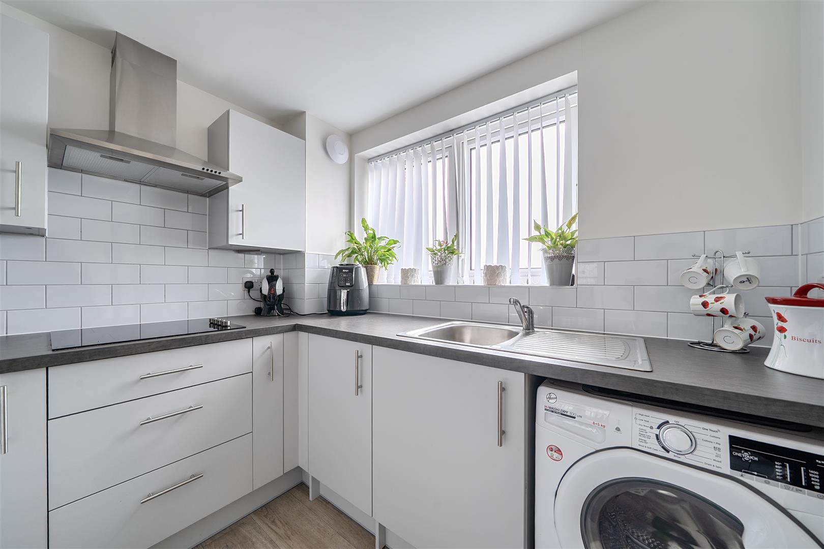 The Kitchen is accessed via the Living Room and offers a range of modern eye and base level units with working surfaces over and tiled splashbacks. There is a built in waist height oven, 4-ring electric hob with extractor hood over, a fridge, freezer and washer/dryer. A window provides light and ventilation.
