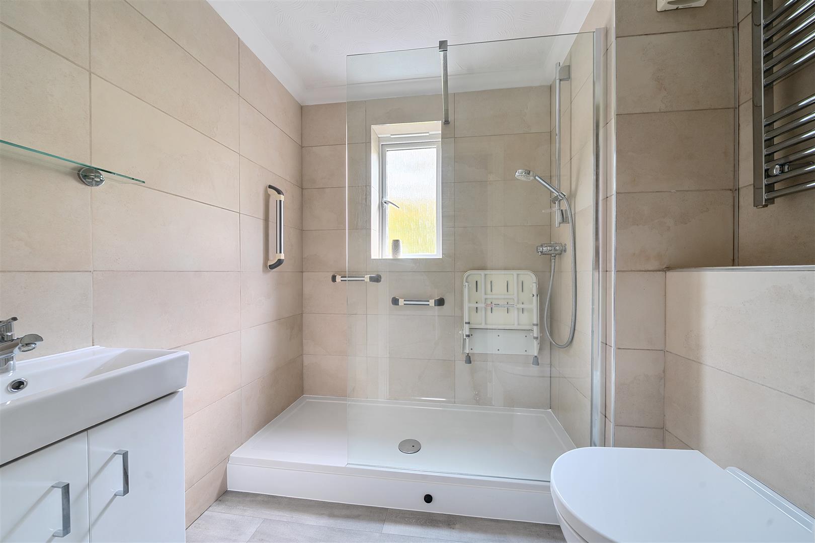 The Shower Room offers a large walk-in shower with handrails, a WC, wash hand basin with vanity unit beneath and a heated towel rail.