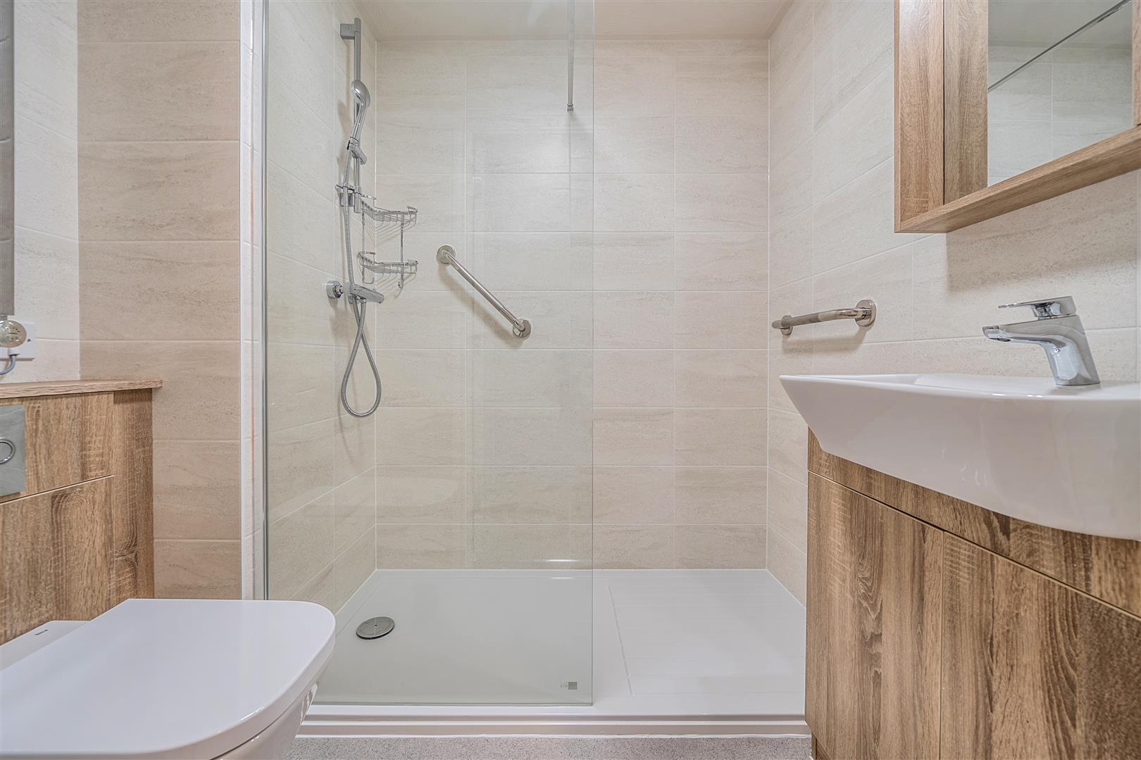 The Shower Room offers a large walk in shower with handrail, a heated towel rail, WC and wash hand basin with vanity unit beneath.