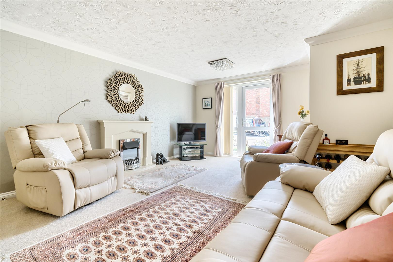 The Living Room offers ample space for living and dining room furniture and benefits from an electric fire with attractive surround. A French door opens to the owners private patio area.