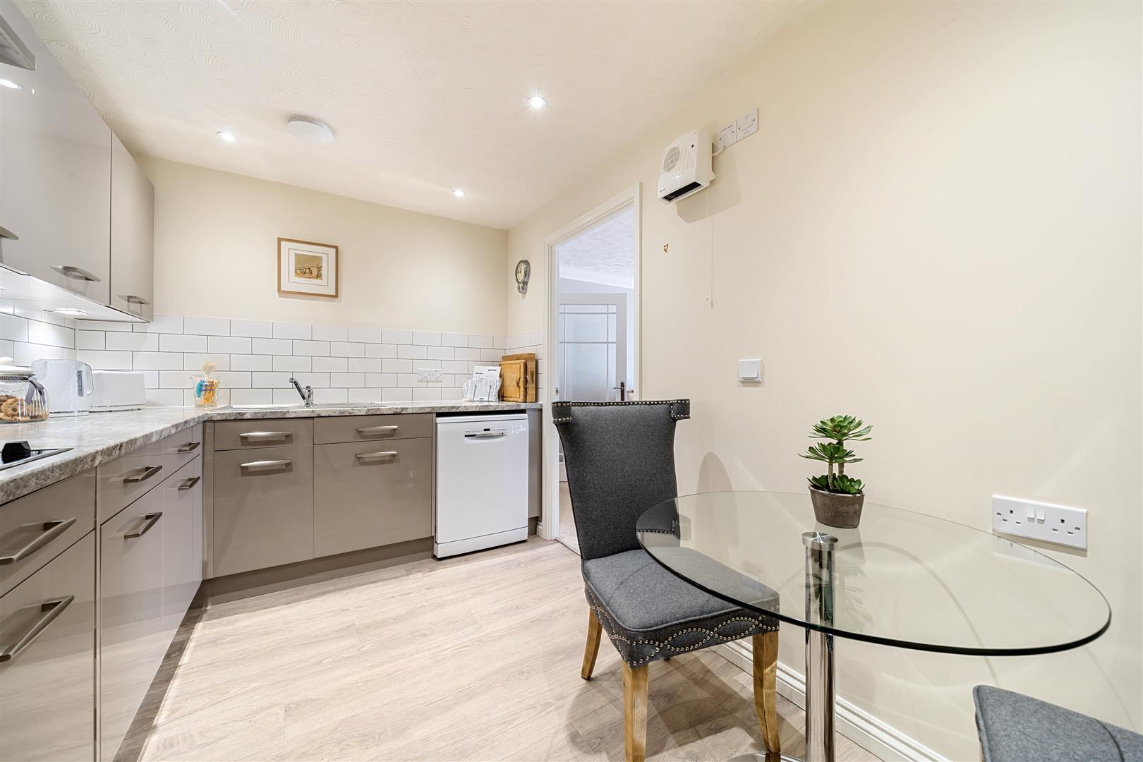 The Kitchen is accessed via the Living Room and offers a range of eye and base level units with recently replaced working surfaces over and tiled splashbacks. There is a built-in waist height oven, 4 ring electric hob with extractor hood over, a dishwasher, a freezer and washer/dryer as well as a water softener unit under the sink. This room also benefits from space for a dining table and chairs.