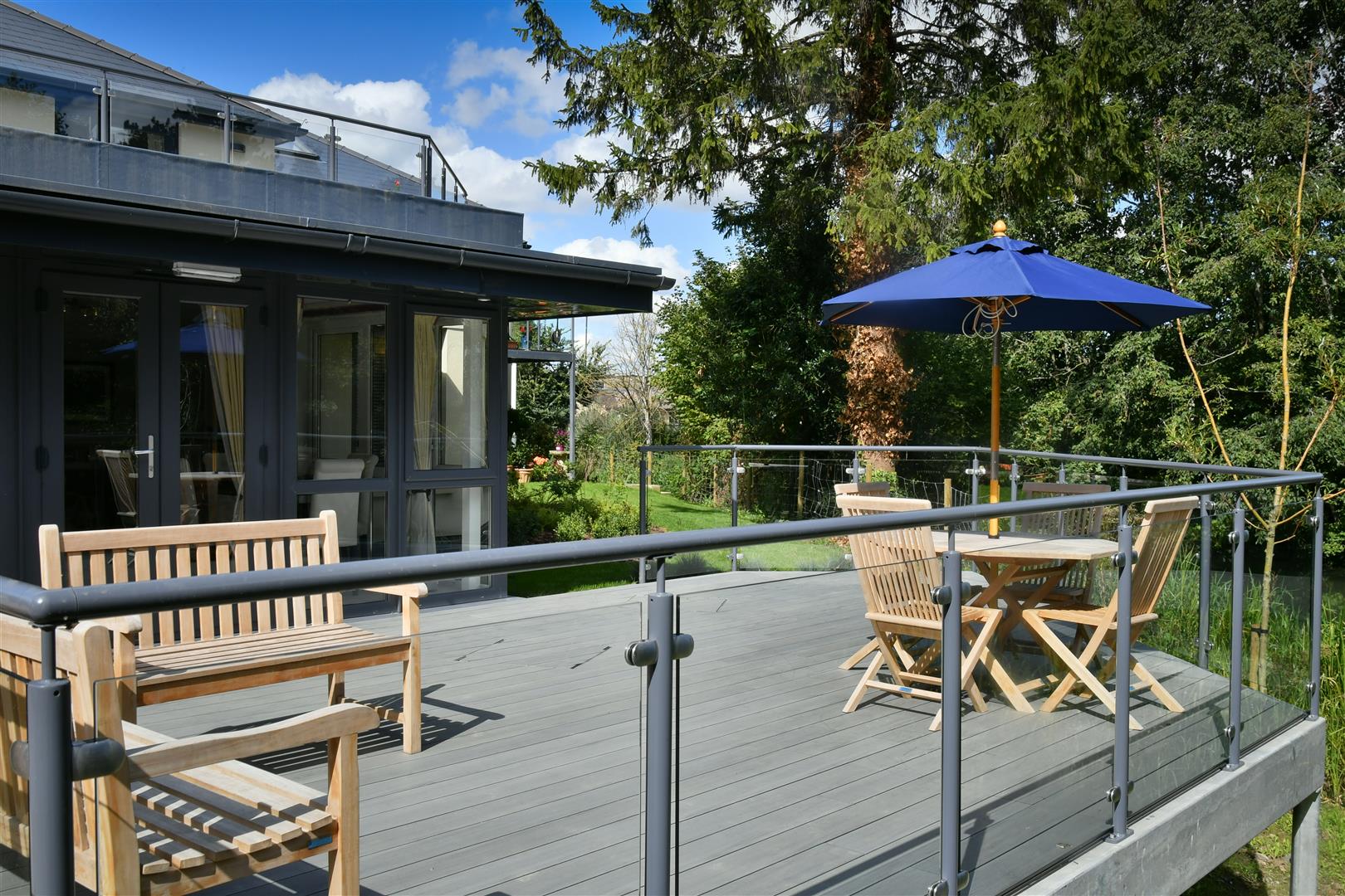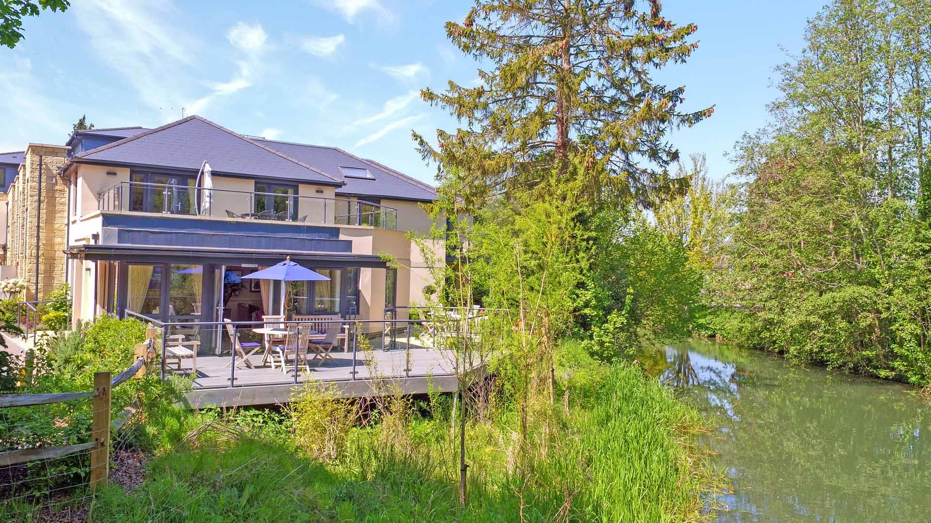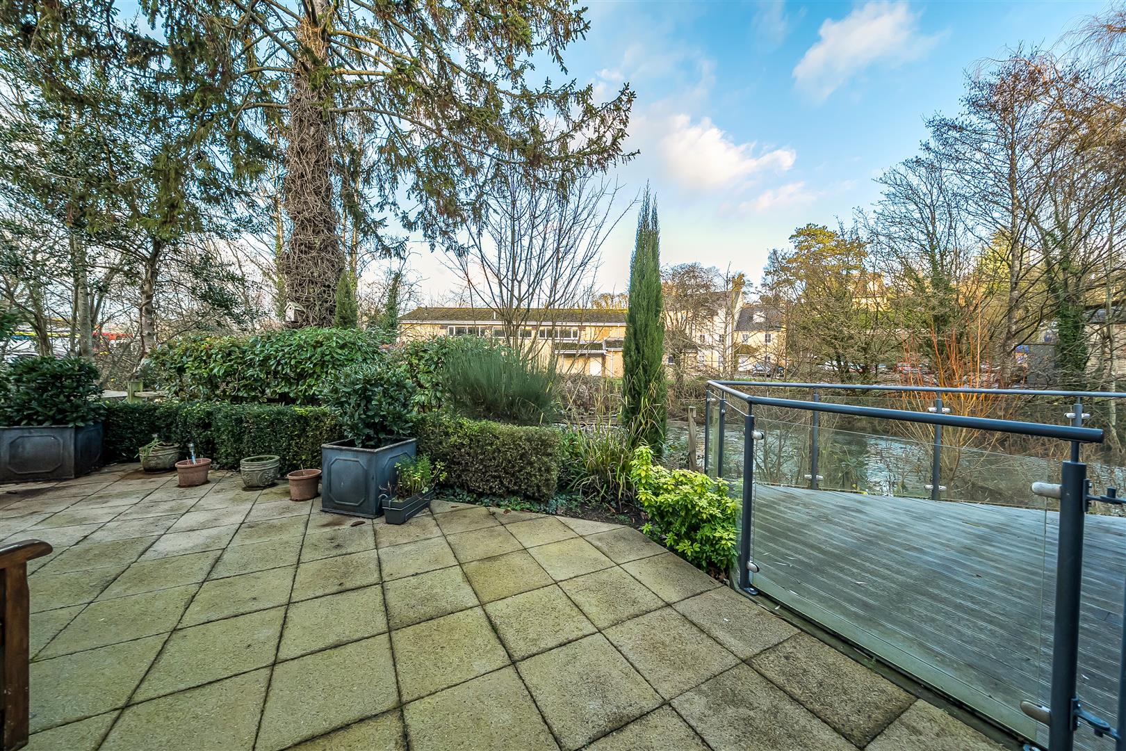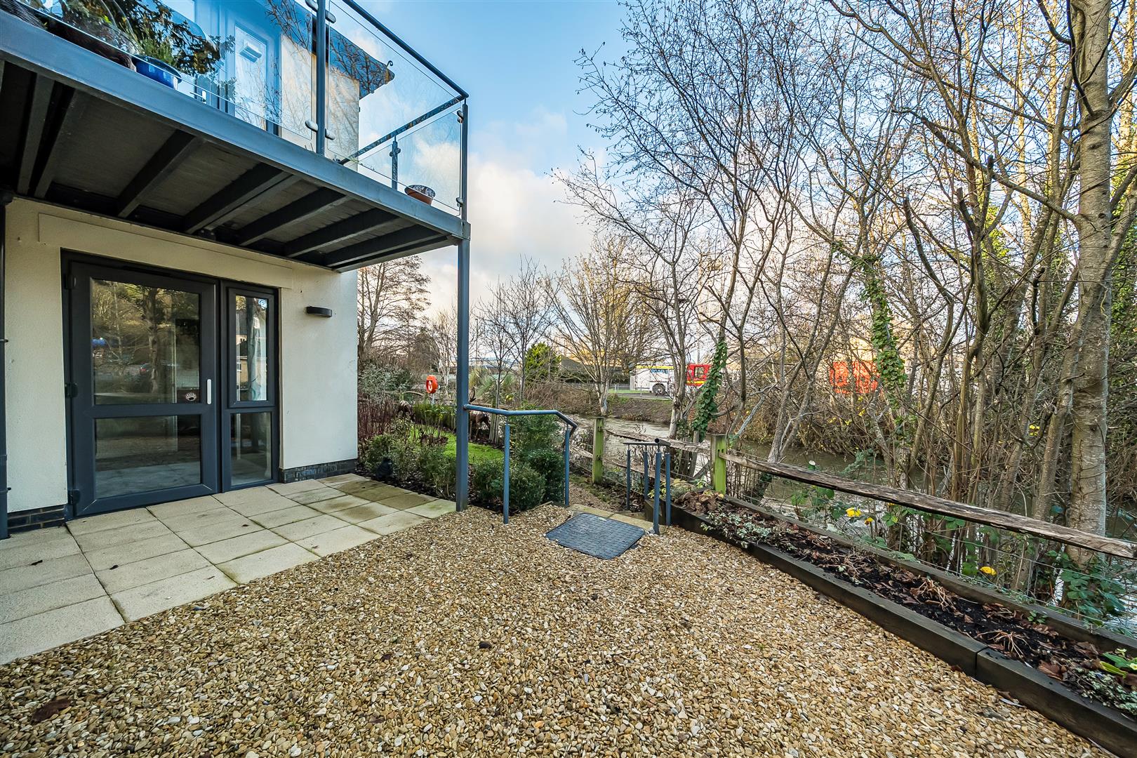 The Lounge offers ample space for living room furniture and has an electric fire with attractive surround, and a door opening onto a patio area with river views.