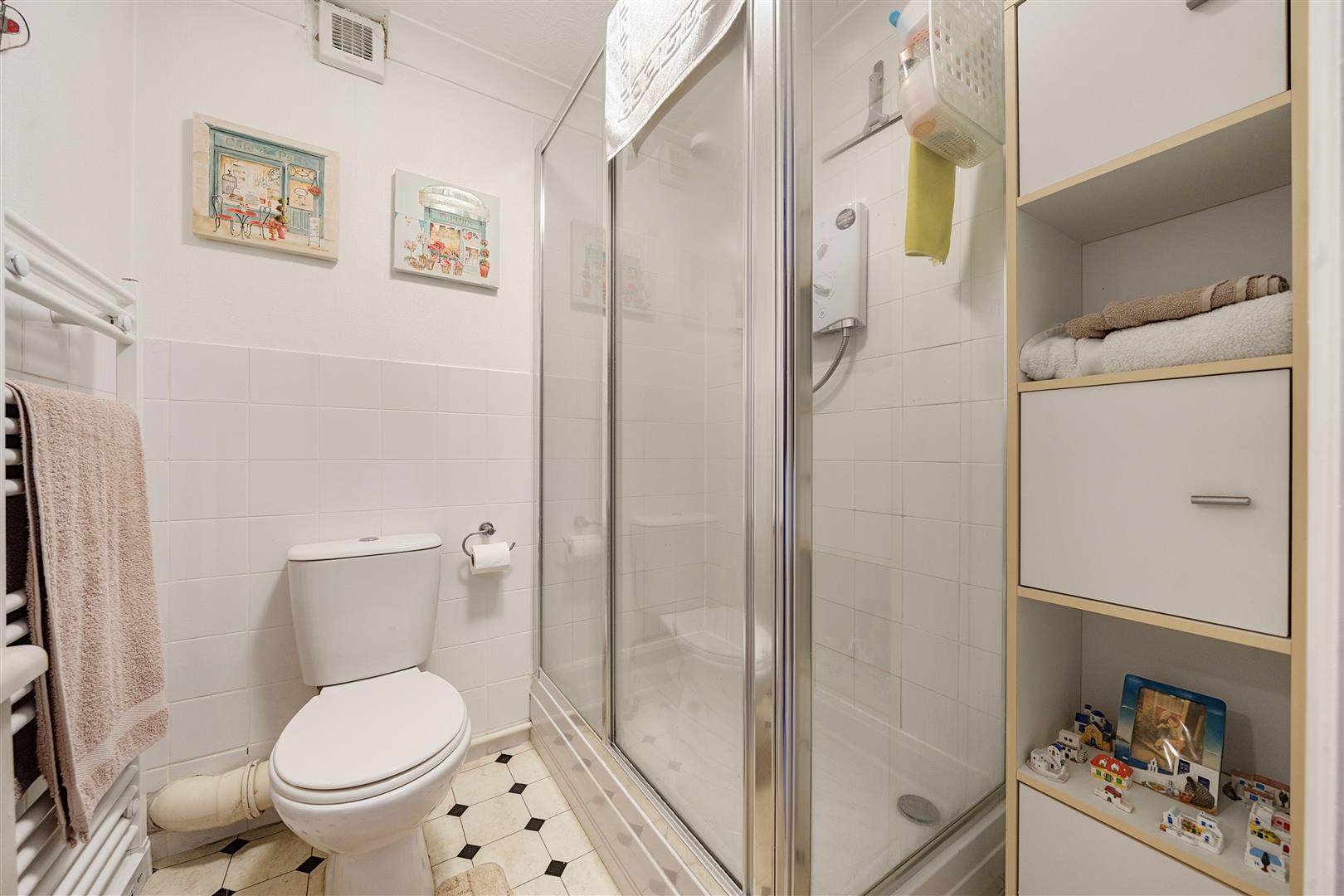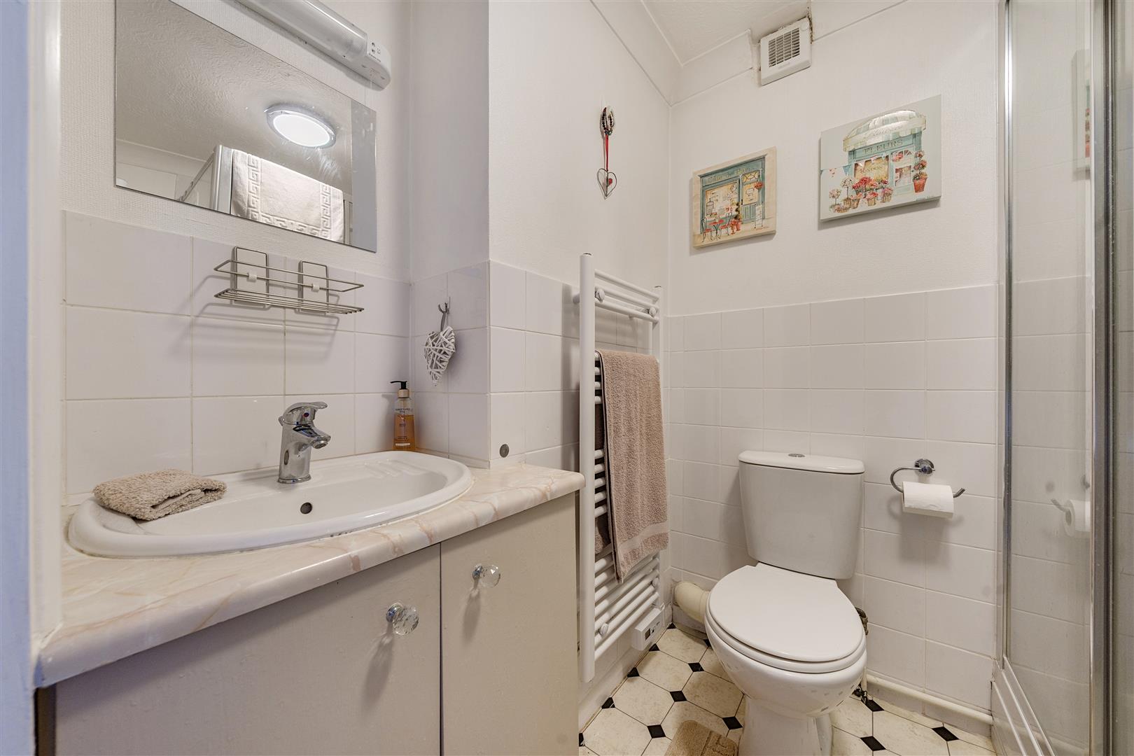 The shower room offers a large shower cubicle, a WC, wash hand basin with vanity unit beneath and a heated towel rail.