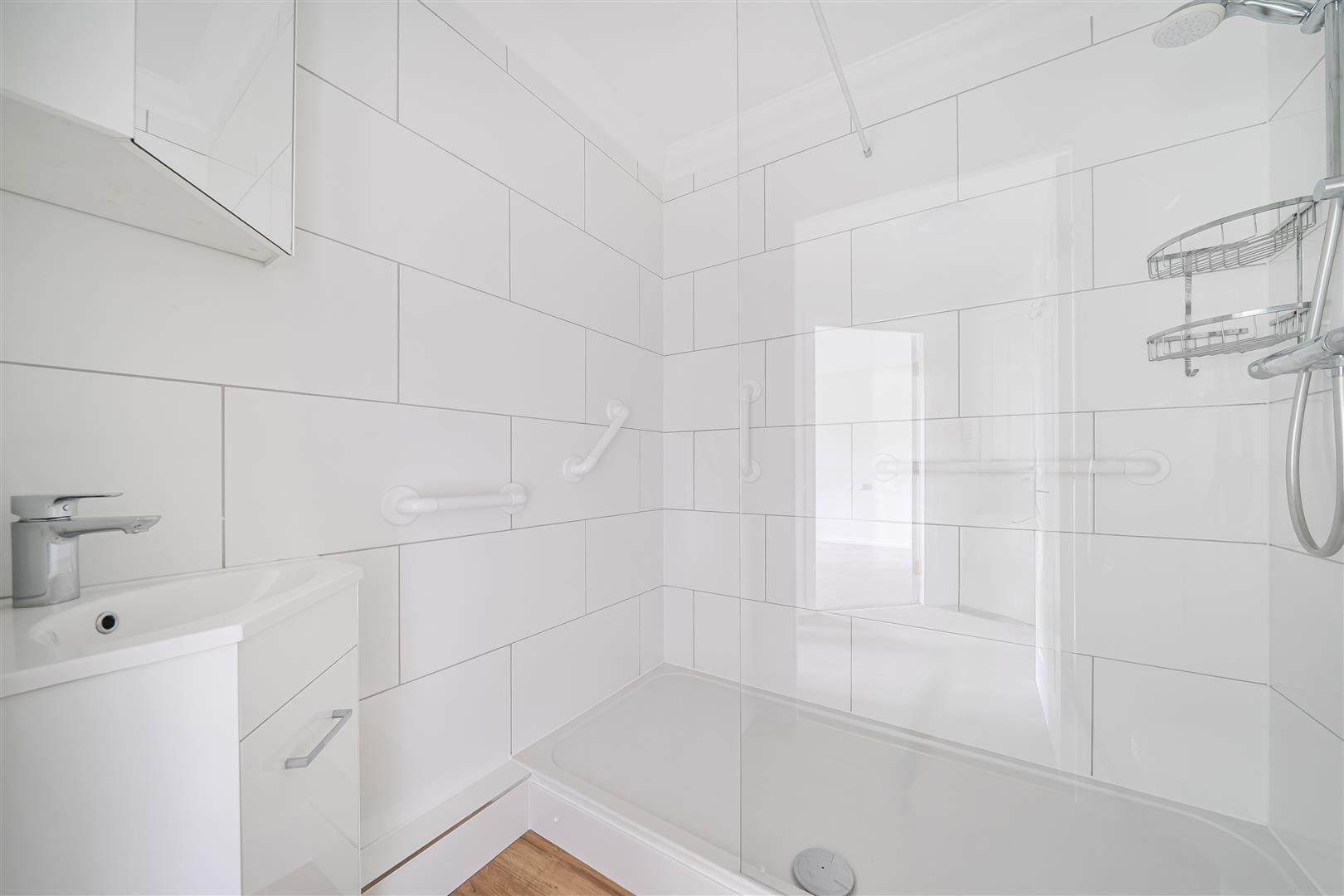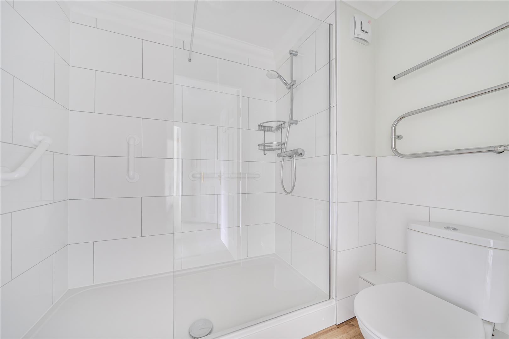 The Shower room offers a large walk in shower with handrail, a heated towel rail, WC and wash hand basin with vanity unit beneath.